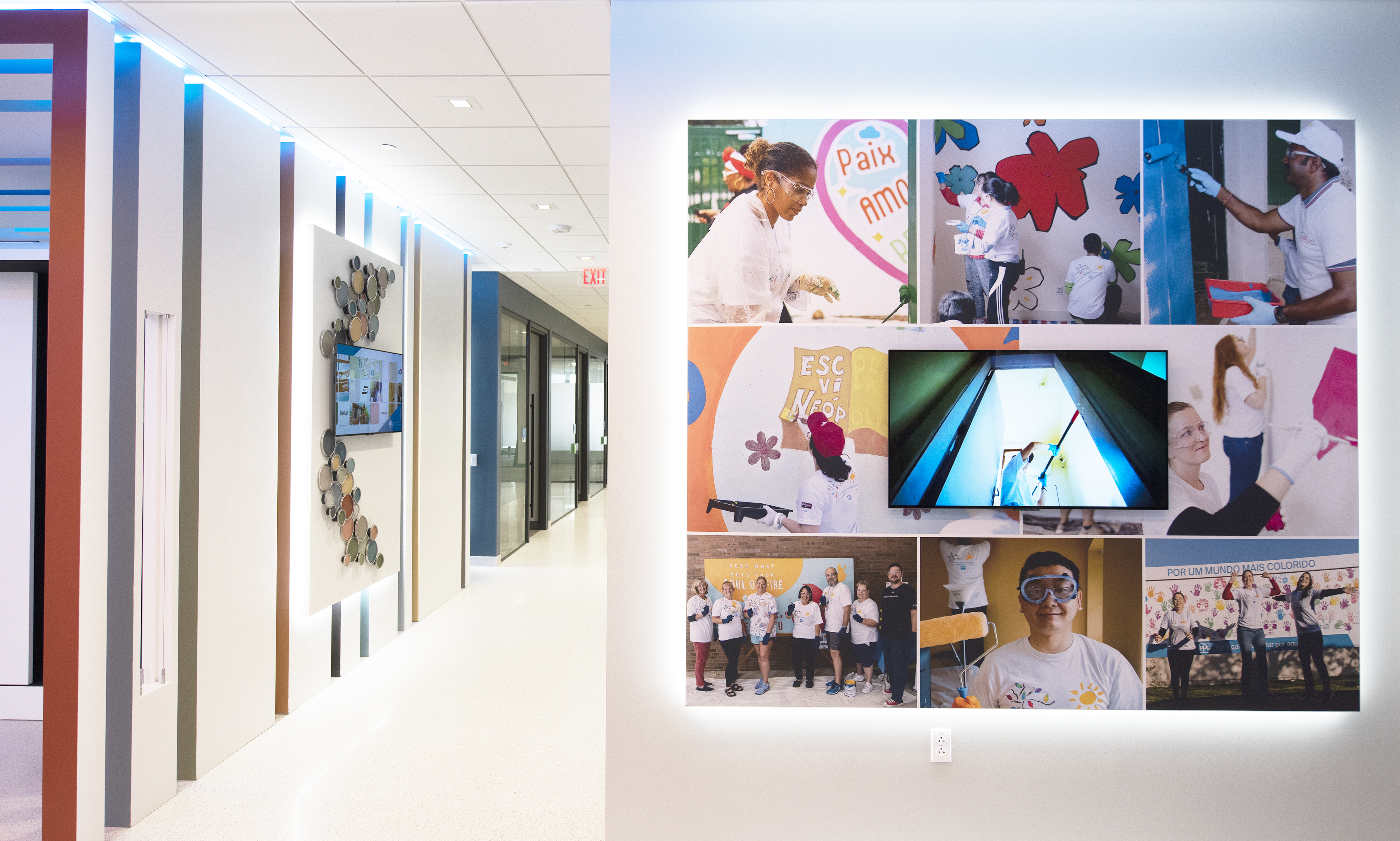 The 1,400-square-foot experience center is part of a recent renovation of the top two floors of One PPG Place, the company’s iconic, Philip Johnson-designed global headquarters. The center features wall coverings, furniture and TV screens from its customers, along with a host of products that exemplify the company’s purpose – WE PROTECT AND BEAUTIFY THE WORLD®.